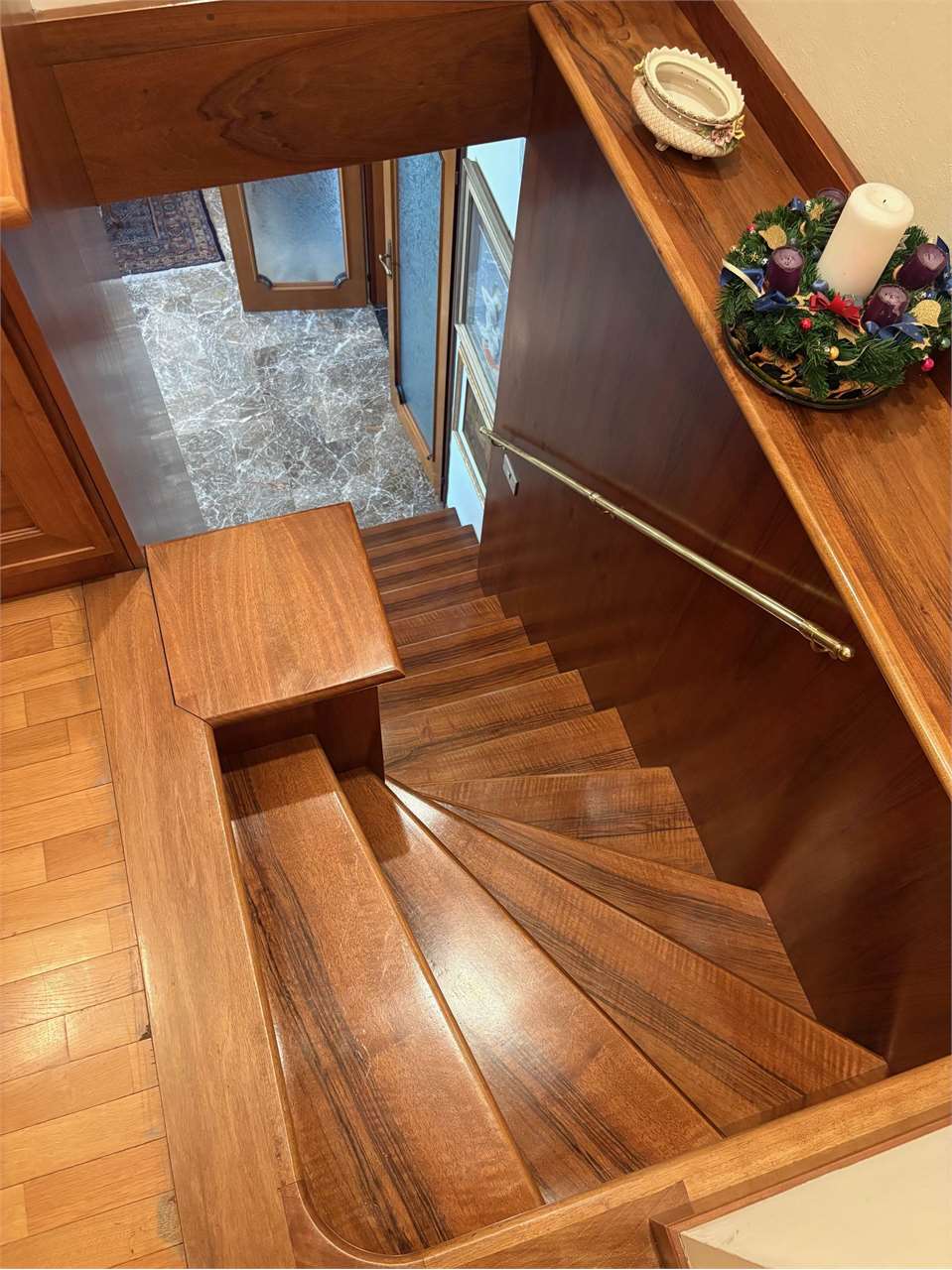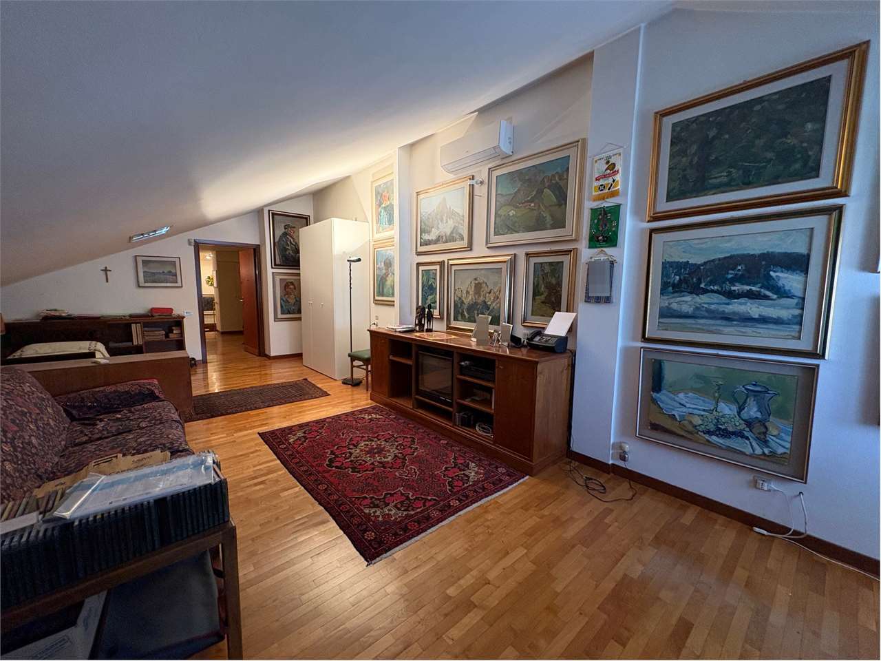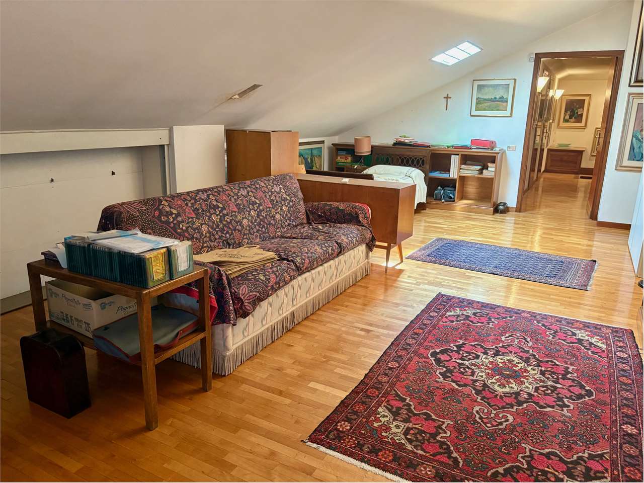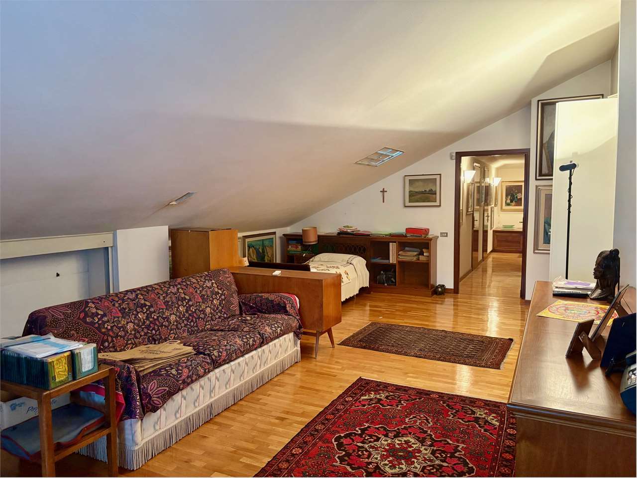 Composto in zona giorno da: ingresso, ampio soggiorno con terrazzo panoramico, cucina abitabile con terrazzino e con caminetto esterno. In zona notte: disimpegno con grande armadio guardaroba, una camera da letto matrimoniale, una camera doppia, una camera singola, un ripostiglio, e due bagni entrambi finestrati. Una scala interna conduce al piano sottotetto dove troviamo un grande studio/quarta camera da letto, una stireria, e tre ripostigli. Completano la proprietà, un garage al piano interrato e una cantina.