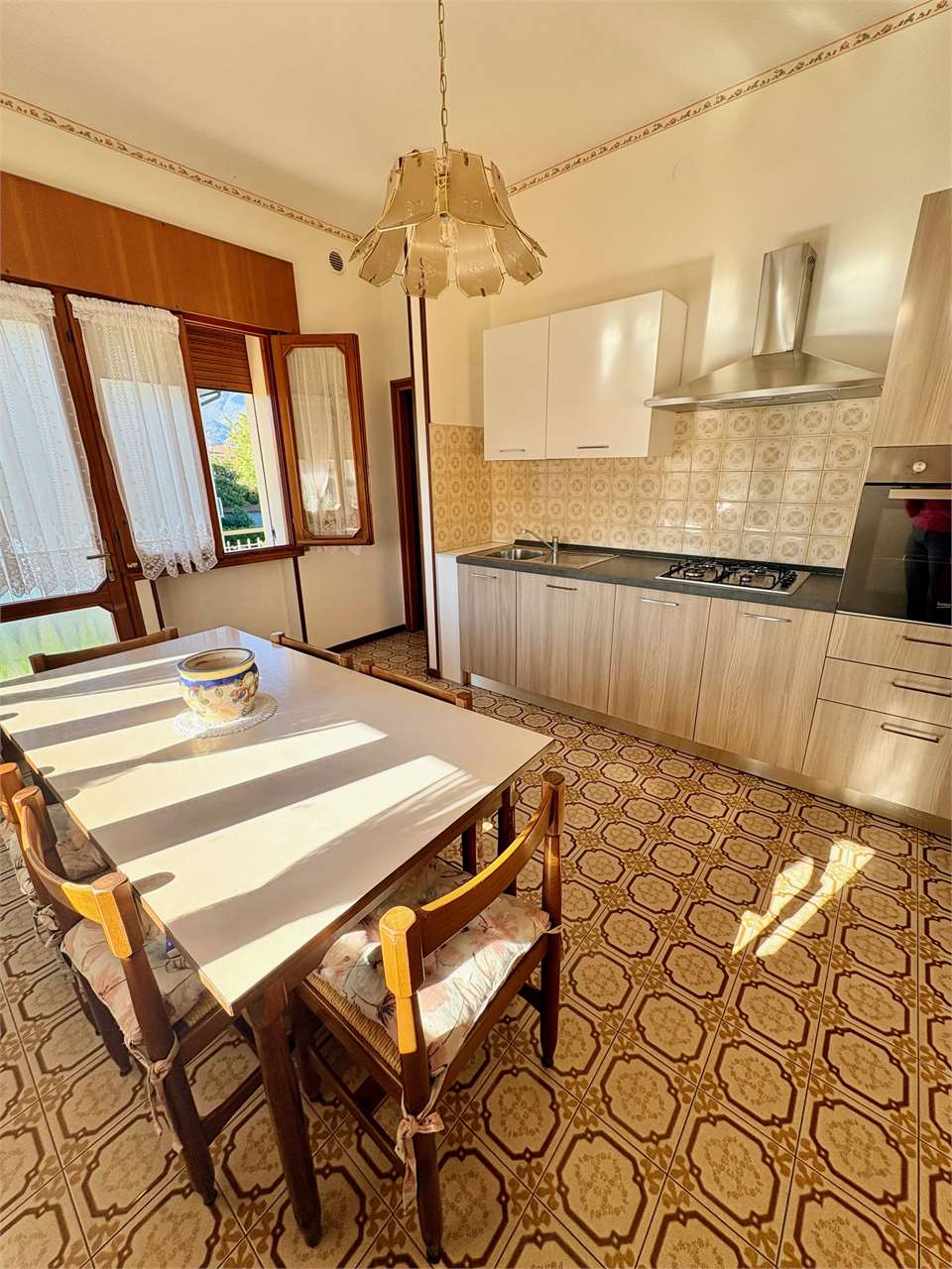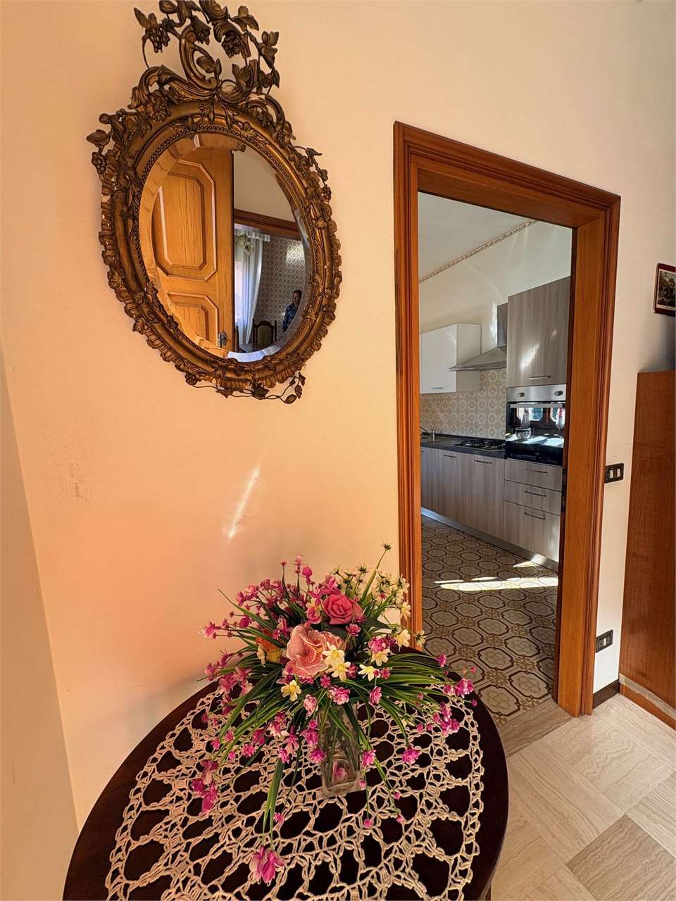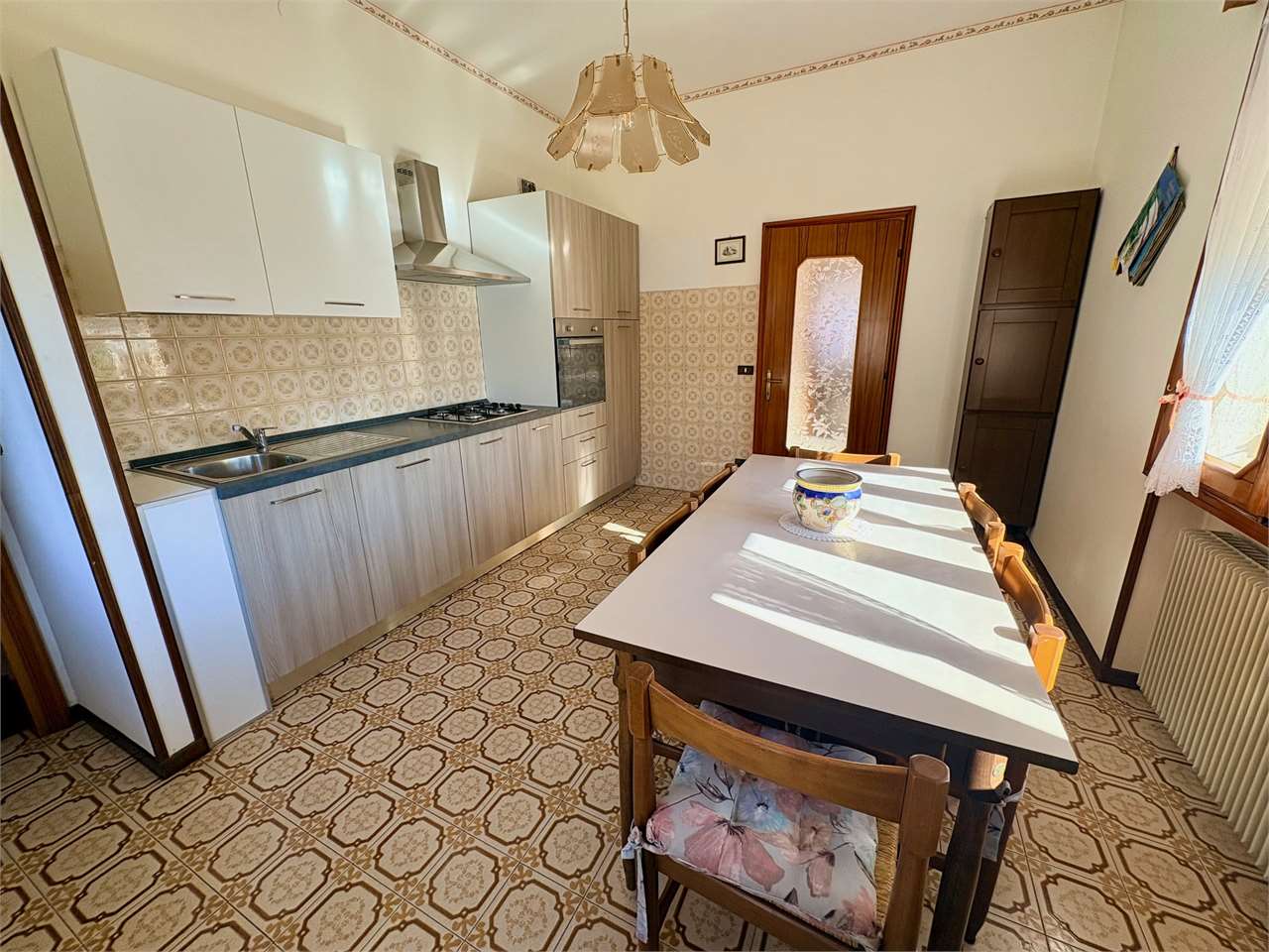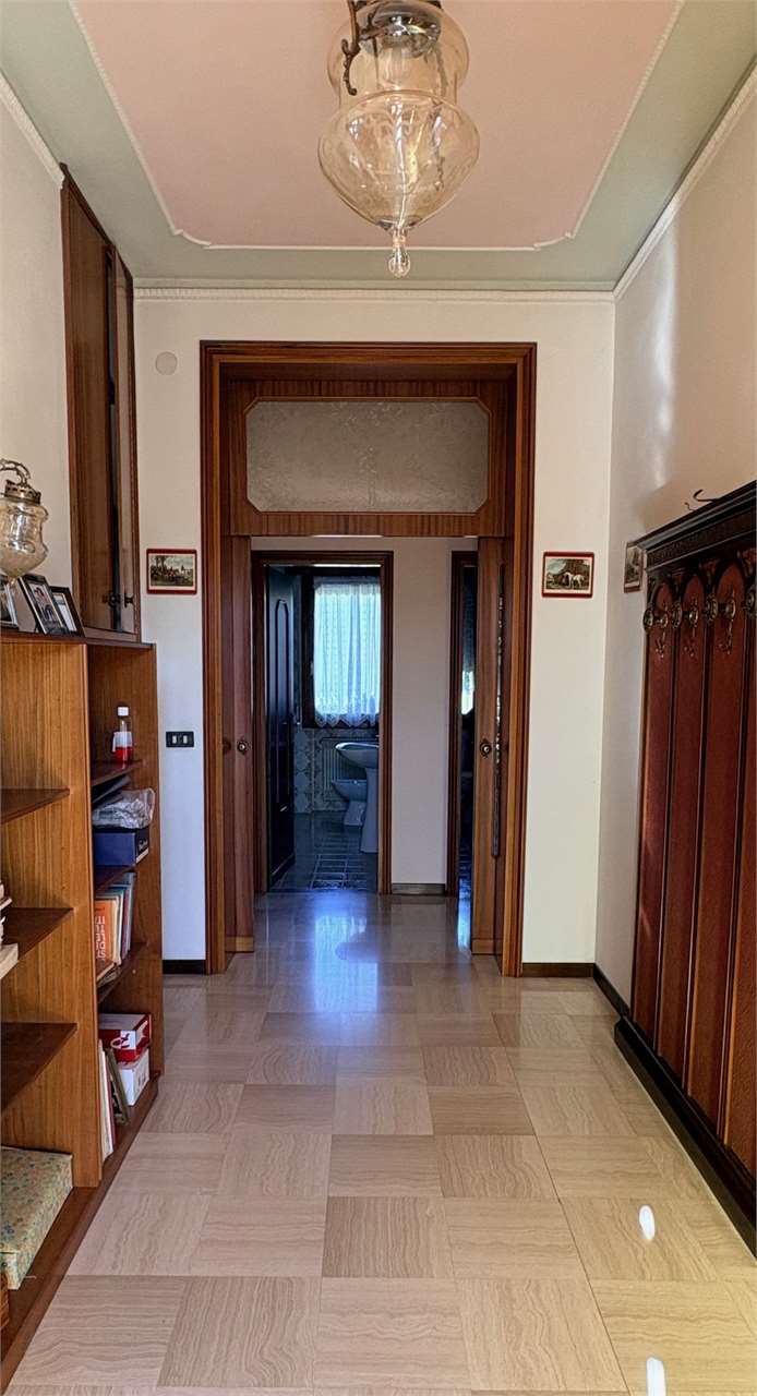 L’abitazione al piano primo, si compone di ingresso, cucina con accesso al terrazzo, soggiorno luminoso, disimpegno, due camere matrimoniali e due bagni. Attraverso una scala interna si accede al piano terra, dove si trovano una grande cantina, un ripostiglio, una lavanderia, una centrale termica, e un ulteriore bagno. La proprietà offre spazi ampi e funzionali.