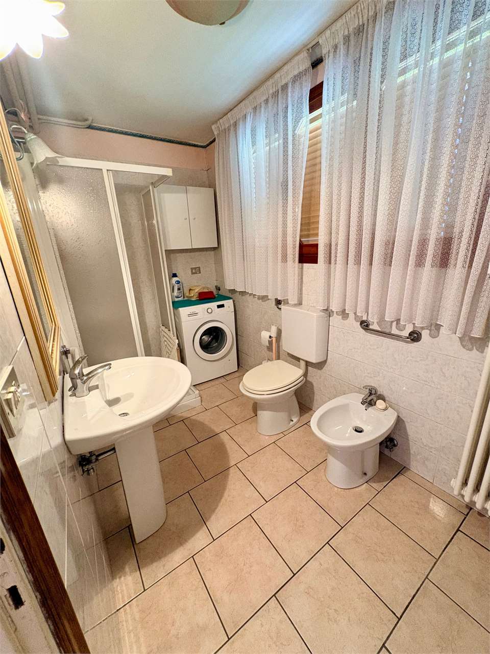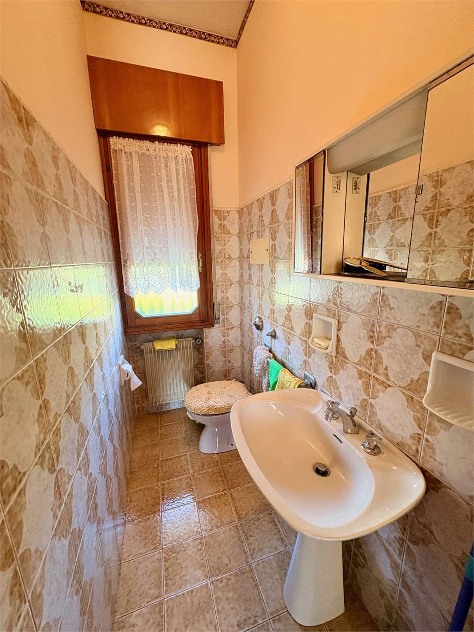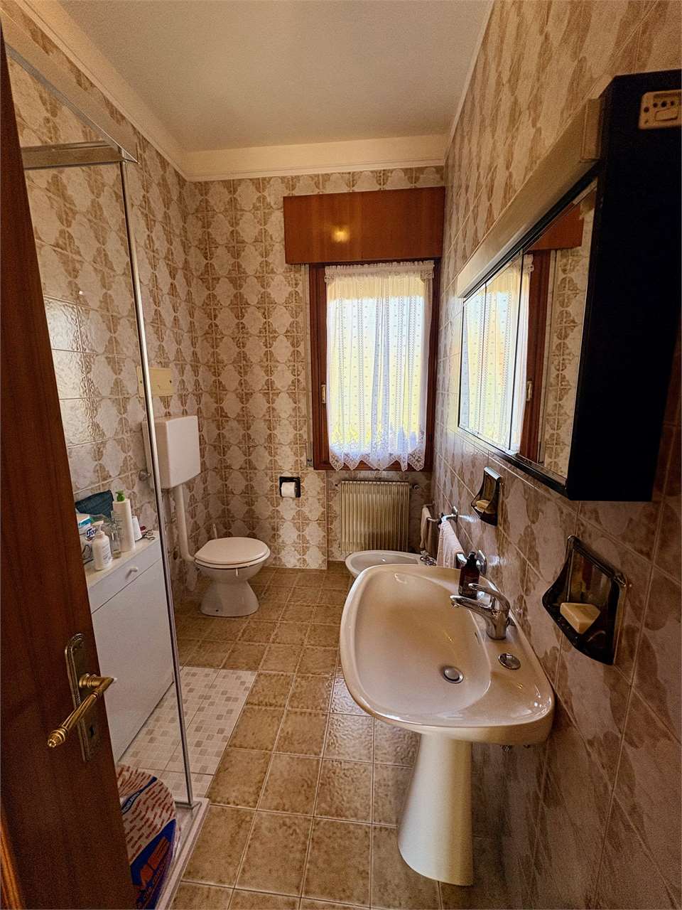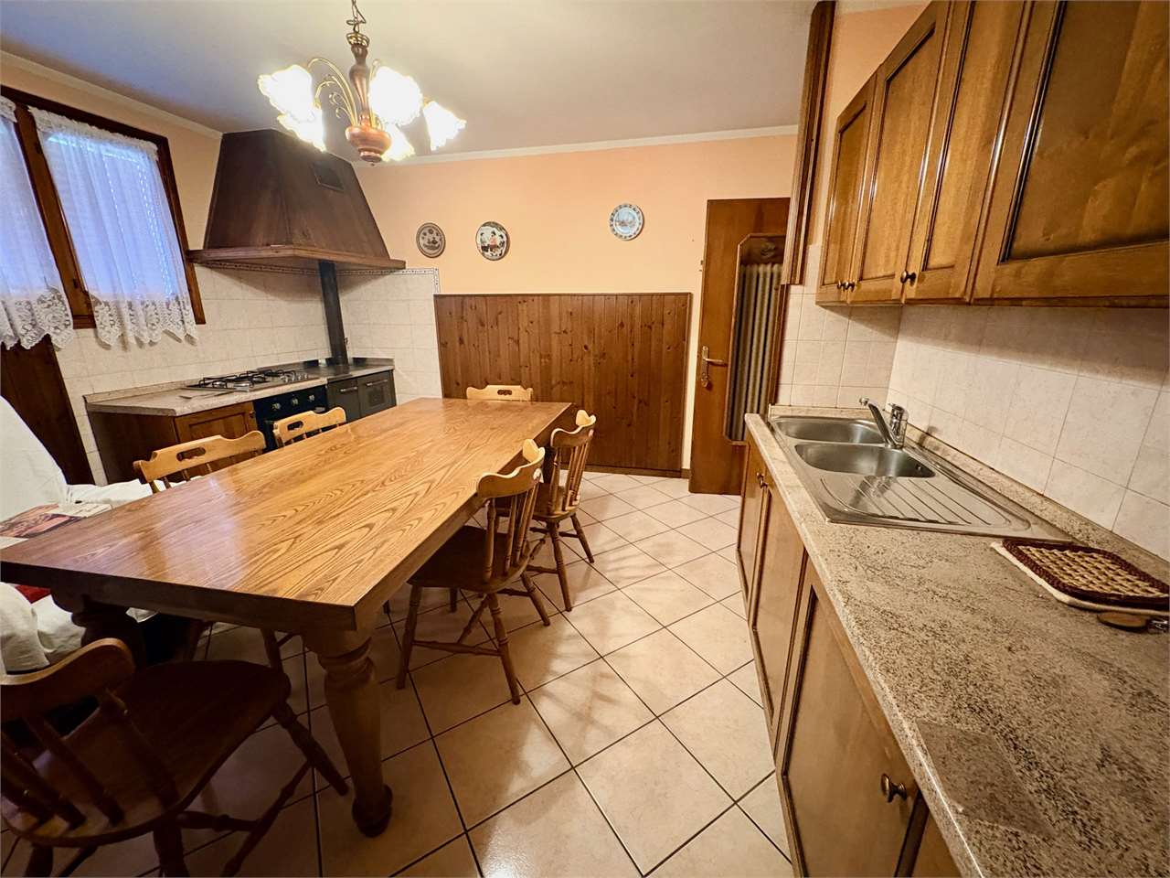 L’abitazione al piano primo, si compone di ingresso, cucina con accesso al terrazzo, soggiorno luminoso, disimpegno, due camere matrimoniali e due bagni. Attraverso una scala interna si accede al piano terra, dove si trovano una grande cantina, un ripostiglio, una lavanderia, una centrale termica, e un ulteriore bagno. La proprietà offre spazi ampi e funzionali.